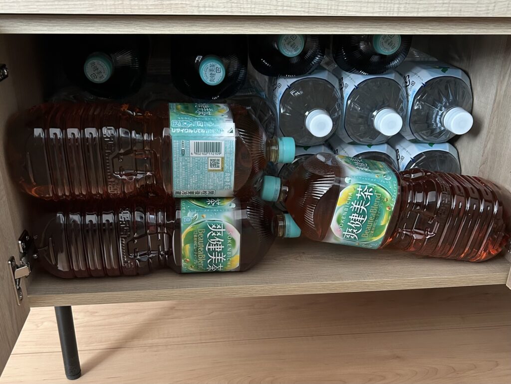 普段の飲料もペットボトルのお茶なので、ギッチギチな棚になっています。